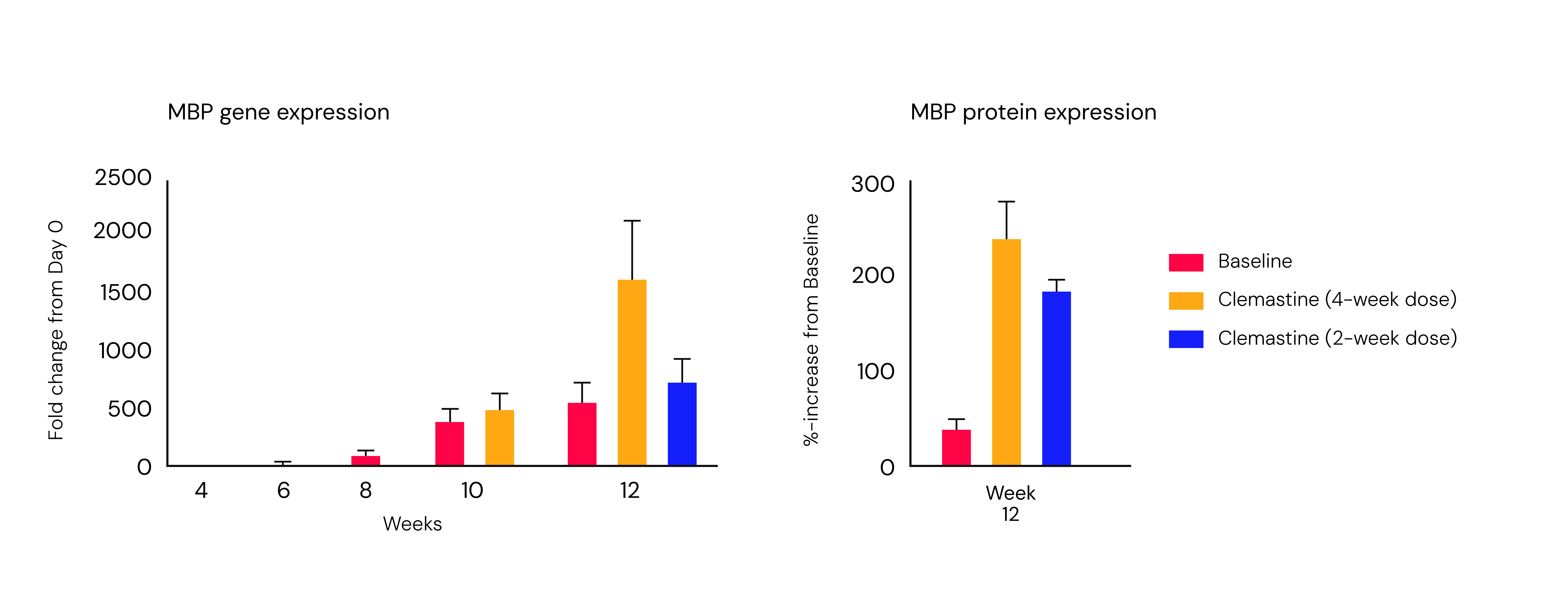 (Left) qPCR geneanalysis demonstrates treatment-dependent MBP upregulation, with maximumresponse at Day 84. (Right) Western blot confirms corresponding protein-levelchanges, demonstrating pharmacological modulation at both molecular and proteinlevels.