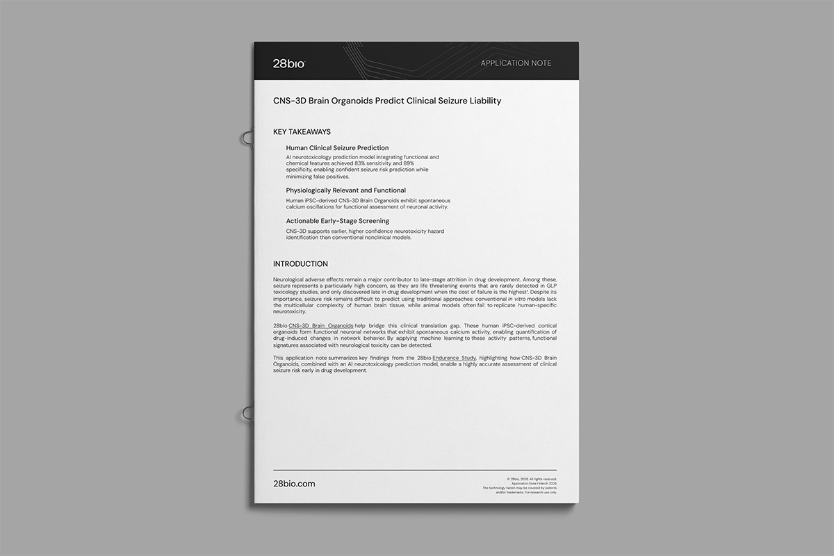 This application note summarizes key findings from the 28bio Endurance Study, highlighting how CNS-3D Brain Organoids, combined with an AI neurotoxicology prediction model, enable a highly accurate assessment of clinical seizure risk early in drug development.